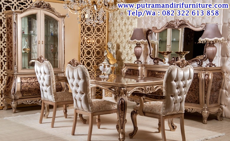 set kursi makan ukiran nezende adalah set kursi meja makan yang digunakan untuk set kursi meja makan di rumah. set kursi makan ini tersedia dalam berbagai model desain set kursi makan klasik, modern dan mewah. Lengkapi set furniture kursi makan rumah anda dengan pilihan produk unggulan dari putramandirifurniture.com